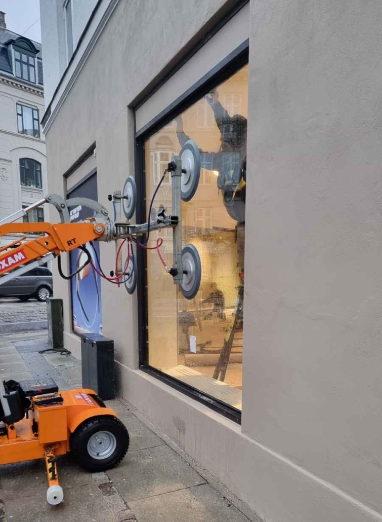 Som en del af facaderenoveringen er der etableret nye glasløsninger langs butikkens facade samt et nyt indgangsparti i glas og aluminium.