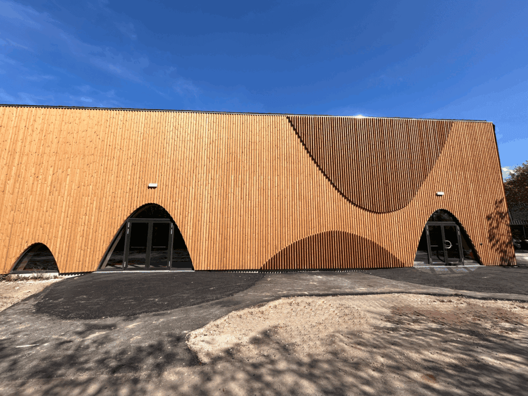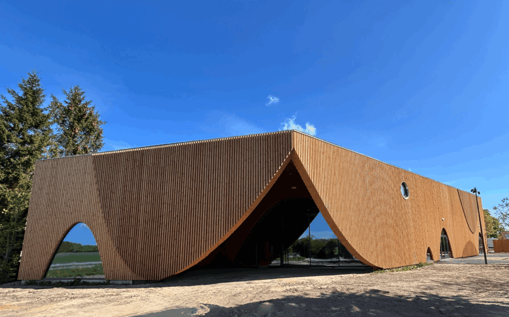 Bygningens karakteristiske facade trækker inspiration fra det omgivende landskab og forener funktionalitet med et æstetisk, legende formsprog. Vi har produceret og monteret glasfacader i skræddersyede, geometriske former med Schüco FWS 50.SI facadesystemet, der sikrer både høj isoleringsevne og stor designfrihed. Systemets fleksibilitet har gjort det muligt at realisere arkitekternes visioner for den bølgende facade, som smelter naturligt sammen med teatrets udtryk og de grønne omgivelser.