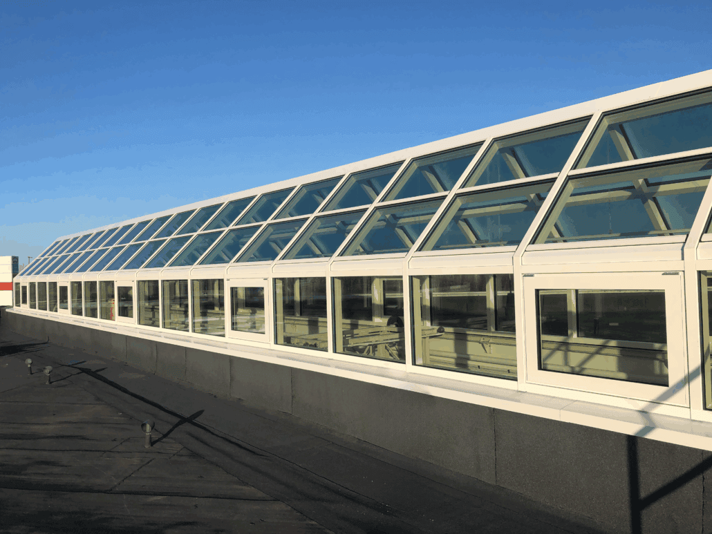 Resultatet blev et nyt glastag med rytterlys, udført i Schüco FWS 50 facadesystem – en elegant og holdbar løsning, der sikrer optimalt lysindfald i bygningen. De integrerede opluk i sidepartierne er udført i Schüco AWS 70.HI og bidrager til naturlig ventilation og et behageligt indeklima.
