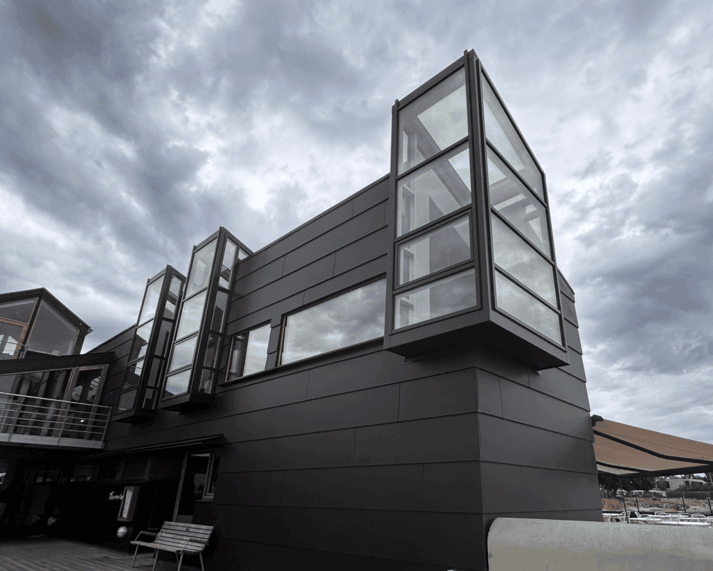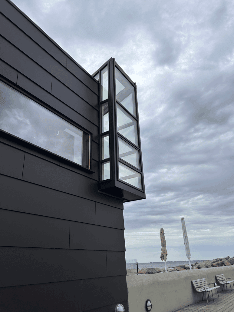Til facaden har vi produceret og installeret næsten fire meter høje karnapper, der er monteret lodret på bygningen. Karnapperne åbner bygningen op mod vandet og bidrager til et markant lysindfald og en forbedret rumoplevelse i restauranten. Elementerne er udført i Schüco FWS 50 facadesystem, som muliggør stor designfrihed og høj termisk ydeevne – perfekt til arkitektoniske løsninger, hvor æstetik og funktionalitet skal gå hånd i hånd. Hver karnap er desuden udstyret med et integreret vindue i Schüco AWS 114.SI.